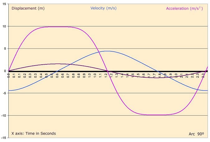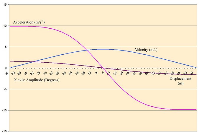 In a computer spreadsheet, the acceleration acting upon the pendulum can therefore be calculated for each moment in time, a small fraction of a second. Then the speed (angular velocity) of the pendulum is found by multiplying the acceleration by the amount of time (a small fraction of a second). The distance traveled (arc) in that amount of time is found by multiplying the angular velocity by the amount of time. The angle in radians is found by dividing the distance by the length of the pendulum. Then the angle in degrees is found by multiplying the angle in radians by 180 and dividing by pi (3.14). The results come together in a chart like this one.