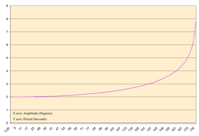 The graphs below show how the period increases rapidly (exponentially) as the angle increases. The period is the time it takes to go back and forth, which is two seconds in this example. The curves are not perfectly smooth because of small rounding errors in the data.