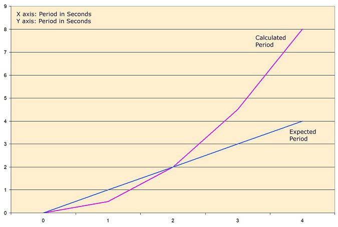 The graph below shows the expected period on the horizontal line (X axis) and the calculated period on the vertical line (Y axis). The data compares the one-second pendulum, which has an expected period and a calculated period of 2 seconds, with the periods for a pendulum of other lengths. The blue line shows what the line would look like without circular error (Y=X).